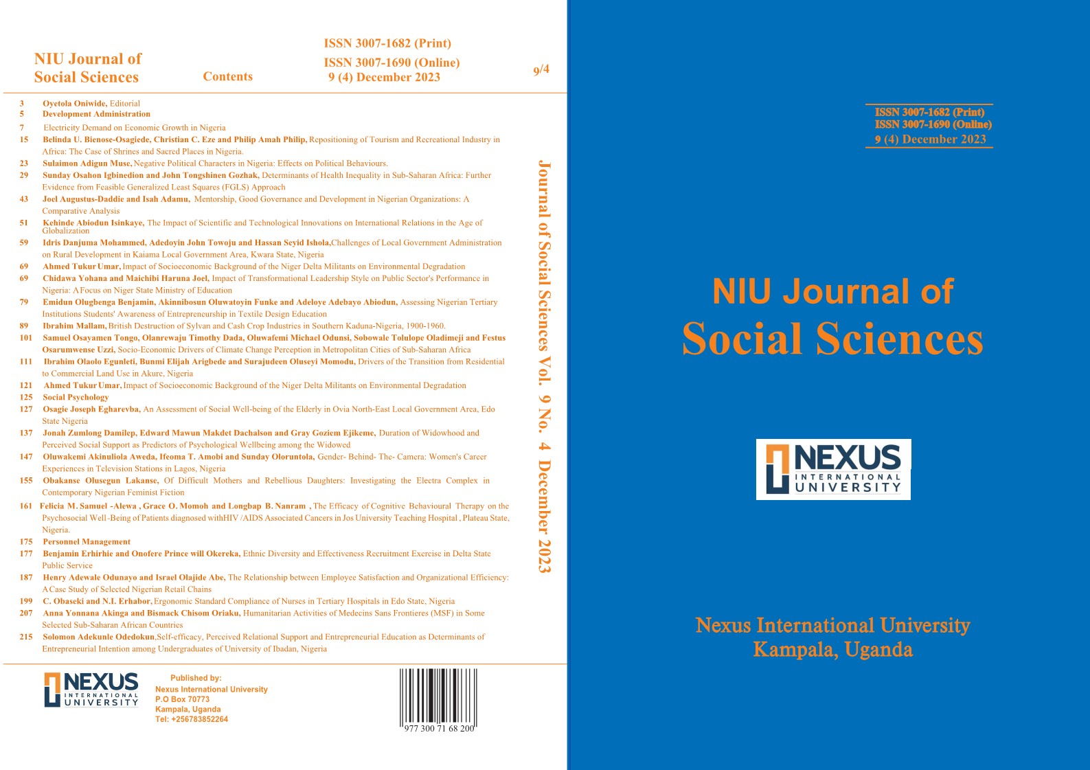 Vol 11 No 3 (2025)This edition of NIU Journal of Social Sciences focuses on Godfatherism, Ethnographic Study, Human Security, Entrepreneurship Mentoring Education, Psychological Distress as well as Effective Mental Health Service Utilization.