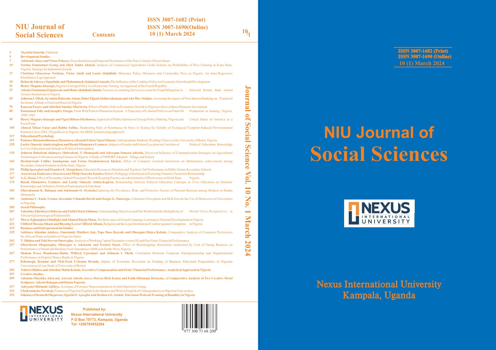 Vol 10 No 1 (2024)This edition of NIU Journal of Social Sciences focuses on Development Administration, Educational Psychology, Social Philosophy, Business and Entrepreneurial Studies as well as Creative Studies.