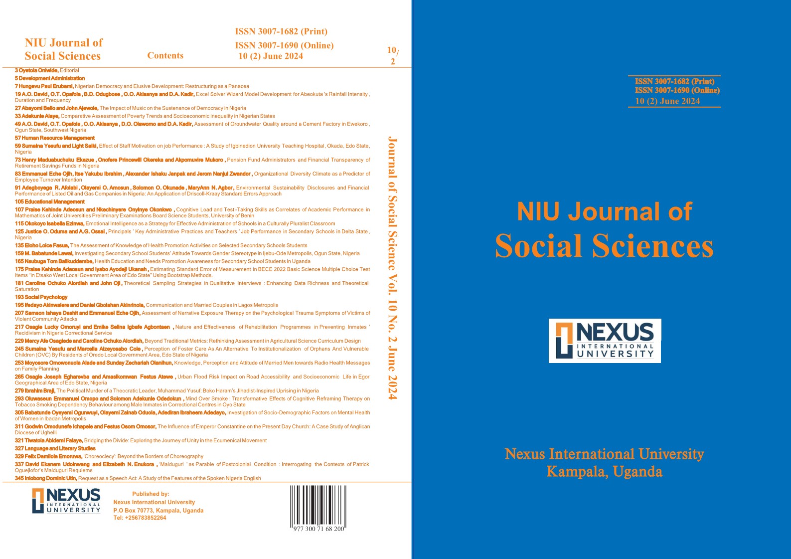This edition of NIU Journal of Social Sciences focuses on Development Administration, Human Reseource Management, Educational Management, Social Psycholophy and Literary Studies.
